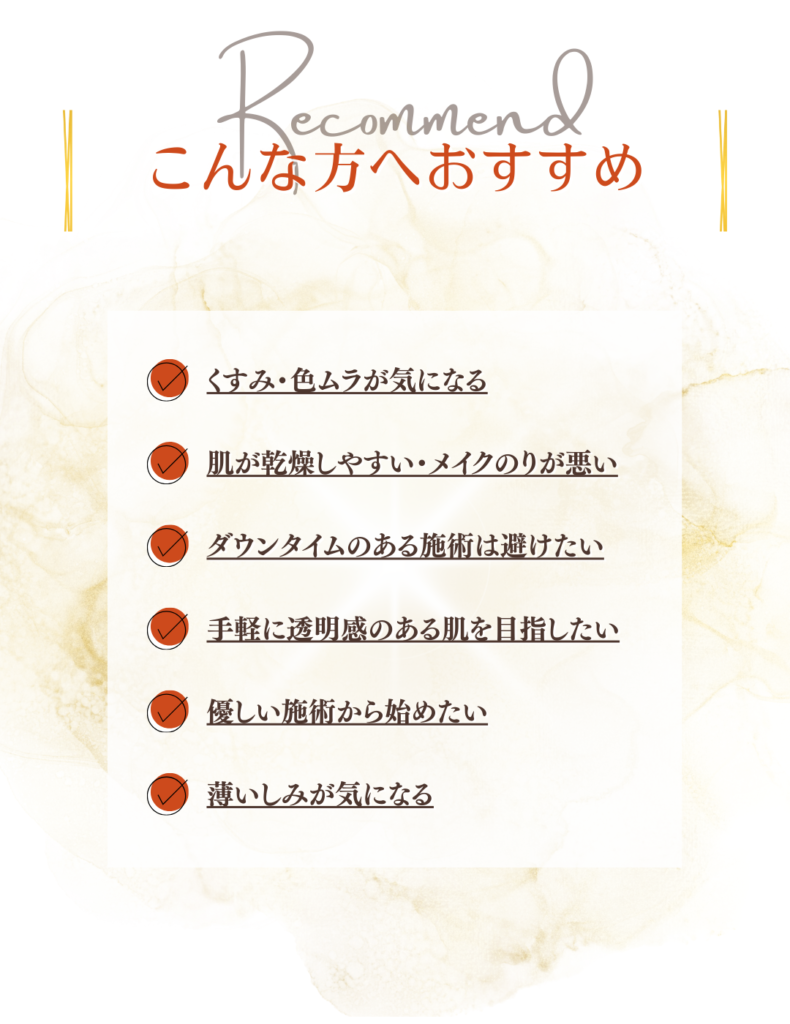 刺激がマイルドで、ダウンタイムが少ないため、定期的な美肌ケアとして取り入れやすい治療です。